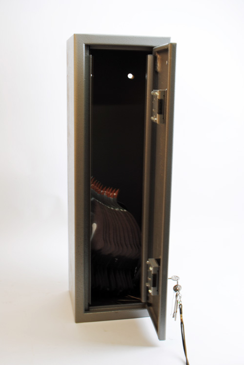 A STEEL TAKE-DOWN GUN SAFE, together with 12 half pigeon decoys
