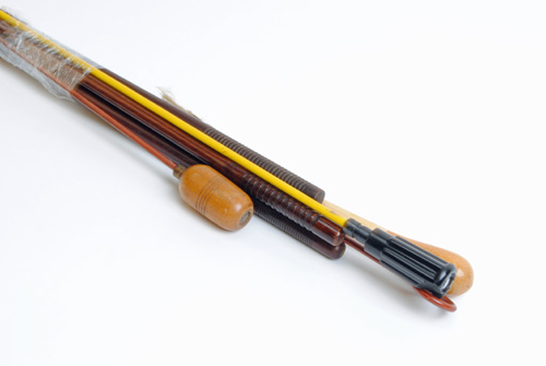 A COLLECTION OF CLEANING RODS WITH AN INTERSTING WALKING STICK