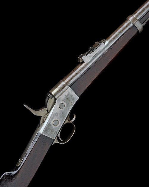 circa 1873, with 36in. sighted barrel, rolling-block action with slab-sided receiver, special hammer (see below), top-tang with three line Remington signature address and patents, walnut butt-stock with iron heel-plate, three-quarter walnut fore-end with three iron barrel-bands and under-barrel iron clearing rod