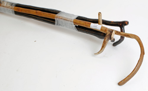 A COLLECTION OF VINTAGE WALKING STICKS WITH A SHOOTING STICKS,