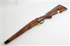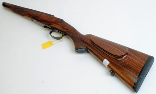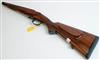 A CUSTOM MAUSER RIFLE STOCK complete with blued lever-release type hinged floorplate (no magazine spring) and blued triggerguard, florally-engraved recoil blocks, border engraved blued steel pistolgrip-cap, rear sling swivel, cheekpiece and 1/2in. rubber recoil pad