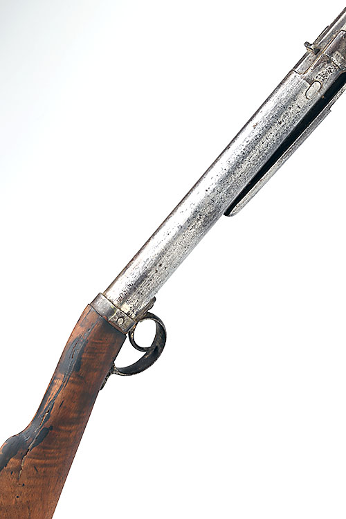 A .25 BREAK-BARREL AIR-RIFLE, UNSIGNED, MODEL 'PUSH-BUTTON MILITIA', serial no. 1408, pre World War One, with smoothbore two-stage 19in. sighted barrel, plain air-chamber with push-button barrel release (sticking), straight hand walnut butt-stock and no provision for fore-end, finish gone