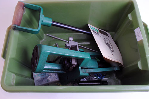 A RCBS 4X4 PROGRESSIVE RELOADING PRESS, in good working order complete with primer tubes and shell plates and suitable for reloading pistol and rifle cartridges