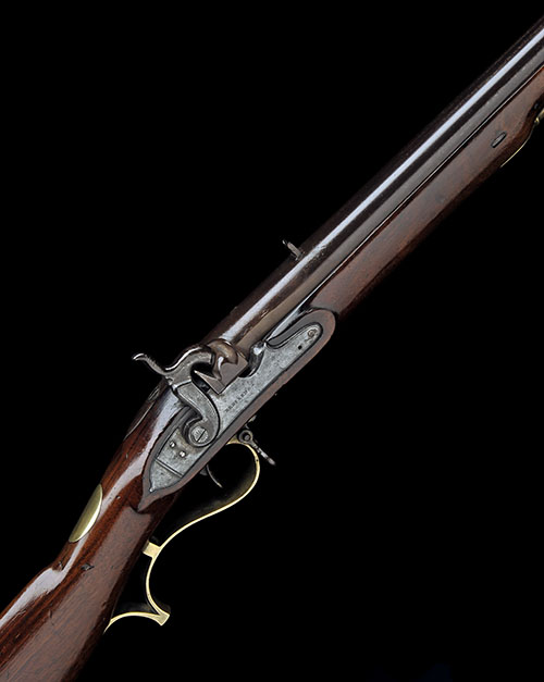 circa 1825, with re-breeched 30 1/4in. barrel, bead fore-sight, standing notch rear-sight, converted borderline engraved bevel edged step tailed lock signed 'REDFERN'S', walnut full-stock with brass furniture including distinctive patchbox and raised lower tang, iron stirrup swivels and ramrod; TOGETHER WITH a brass ribbed-hilted bayonet with 'D' shaped knuckle-bow and straight 23 1/4in. spear-point blade false edged for the last 5 3/4in.