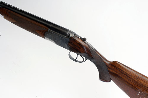 LUIGI FRANCHI 12-BORE DOUBLE-TRIGGER OVER AND UNDER EJECTOR, serial no. 5637, 30in. nitro barrels with 6mm ventilated matt top-rib, 2 3/4in. chambers, bored approx. true cyl. and 1/4 choke, hold-open toplever, manual safety, border engraving, bright finish, 14in. pistolgrip stock including buttplate (cracked), weight 7lb. 2oz.