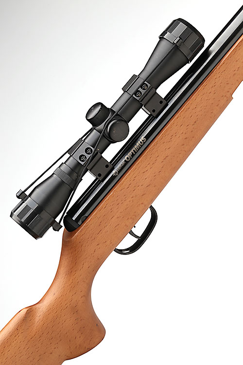 A .22 BREAK-BARREL AIR-RIFLE SIGNED CROSMAN, MODEL 'OPTIMUS', serial no. D12C08136, recent, with 16 1/2in. sighted barrel, blued air-chamber and beech half-stock, complete with a CENTER-POINT 4x32 telescopic sight, appearing little used