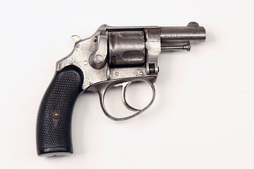 A .25 (ACP) FIVE-SHOT POCKET-REVOLVER SIGNED AUG. LEBEAU, serial no. 5097, circa 1900, with ovoid 1 3/4in. sighted barrel, the top-strap signed 'AUG. LEBEAU, FABT. A LIEGE', fluted swing-out cylinder, solid frame, plated hammer and trigger, chequered hard rubber grips, no finish remaining except where noted