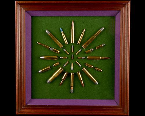 A MODERN GLAZED WOODEN CARTRIDGE DISPLAY BOARD With stained oak frame surround 15" x 15" with purple felt bevelled inner board surrounding the green felt board. with twenty nine pistol and rifle cartridges in a radial display. ( The majority appearing inert , however a .577/.450 and .22 rimfire examples appearing licenceable, so subject to a collectors license). RFD only