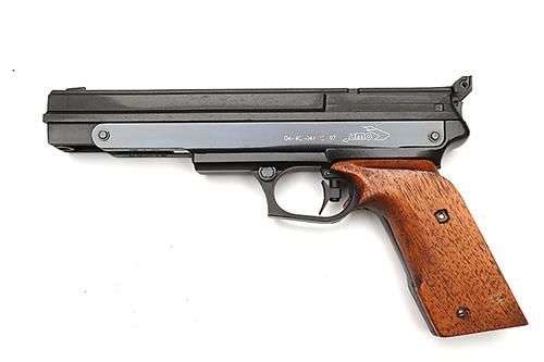 A CASED .177 SINGLE-STROKE PNEUMATIC AIR-PISTOL SIGNED GAMO, MODEL COMPACT, serial no. 04-4C-044913-97, with concealed 9in. barrel, kevlar shroud with adjustable sights, blued frame-sides, slimmed or replaced walnut grips, complete with an abs plastic carry case