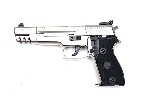 A CASED .177 CO2 POWERED AIR-PISTOL SIGNED RWS, MODEL '225 NICKEL TARGET', serial no. E7431540, with 6in. barrel including muzzle-weight, adjustable sights, matt nickel finish and black plastic chequered grips, complete with its makers plastic case, original sights and spare magazine