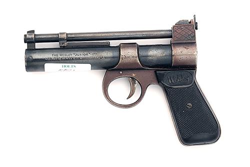 A SCARCE .177 BARREL-COCKING AIR-PISTOL SIGNED WEBLEY & SCOTT, MODEL 'FACTORY ENGRAVED JUNIOR', batch no. 789, with the Birmingham '4' address, 6in. barrel, the breech-block engraved with intersecting diagonal lines with center-dots, adjustable rear-sight, blued air-chamber, cast frame (purpling) and chequered hard rubber grips