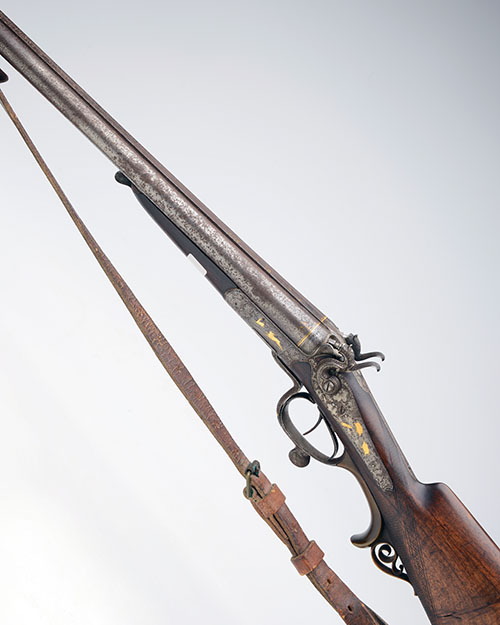 THE STOCK, ACTION AND FORE-END ONLY OF A TH. ROSE, DIEZ 16-BORE ROTARY-UNDERLEVER HAMMERGUN, n.v.s.n., ornately carved percussion fences, elongated top-strap, rebounding back-action locks, deeply engraved with acanthurs scrolls and gold vignettes of game scenes, ornately carved horn pistolgrip