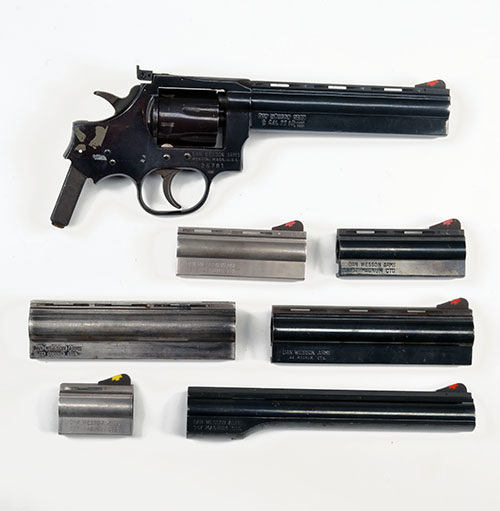 THE MAJOR PARTS OF A .22 (L/R) SIX-SHOT REVOLVER SIGNED DAN WESSON, serial no. 26781, together with another six barrel shrouds of differing lengths