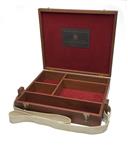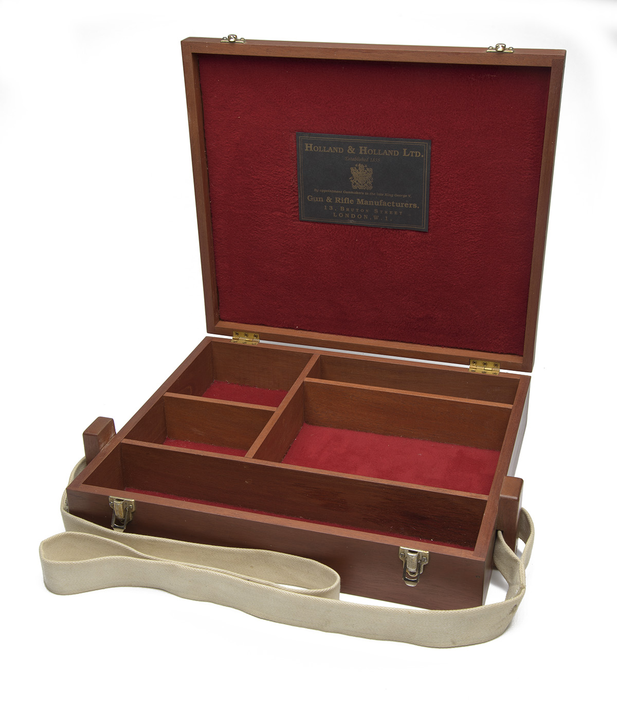 A TIMBER TARGET RIFLE ACCESSORY WOODEN BOX, divided into five compartments, the interior lined with red baize, a Holland & Holland copy trade label, canvas shoulder strap