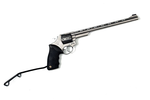 A .22 LR LONG BARRELLED REVOLVER SIGNED TAURUS serial no. VH975934 with 12in barrel having a ventilated top rib, fluted 7 shot cylinder, the whole in stainless steel, with black rubber grip bearing Taurus medallions and black plastic coated steel wrist brace extension (taking its over all length to over 24in) rear sight removed/absent (presumably to permit mounting a scope). Please note this item is a section 1 category firearm to posses in the UK.