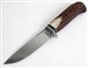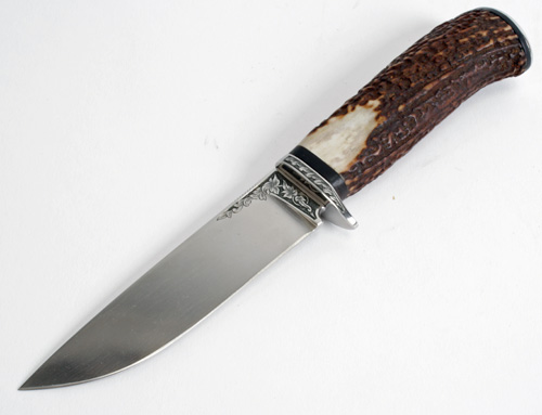A FINE STAG HORN ENGRAVED HUNTING KNIFE, recent ,with 5in. spear point stainless steel blade engraved at the hilt, stag horn handle, floral engraving to the cross-guard and signed 'FARKA' , polished bone handle and engraved wolf on the butt (no scabbard)