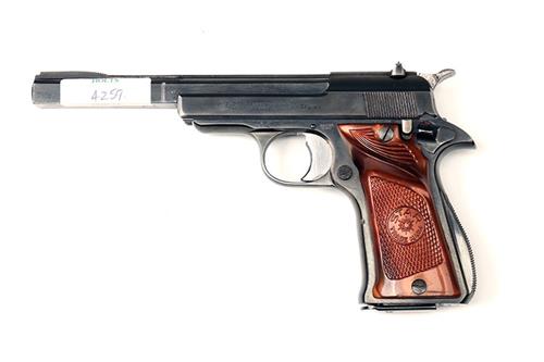 A .22LR SEMI-AUTOMATIC PISTOL SIGNED STAR, MODEL F SPORT serial no. 644104 with 6in. exposed slab section barrel (foresight blade missing) with blued finish to barrel (some marking),frame & slide with chequered plastic factory grips