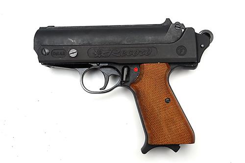 A BOXED .177 CONCENTRIC-PISTON AIR-PISTOL SIGNED RECORD, MODEL 'JUMBO', serial no. 10494, with fixed sight air-chamber, concealed 6in. barrel, blacked frame and chequered walnut grips, complete with its maker's card carton with polystyrene inner