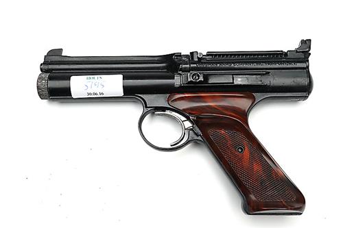 A SCARCE BOXED .22 CO2-POWERED REPEATING AIR-PISTOL SIGNED CROSMAN, MODEL '600', serial no. 095225, circa 1960, with 5in. rifled barrel, adjustable sight, black enamelled die-cast barrel housing and receiver signed 'CROSMAN ARMS COMPANY, INC. FAIRPORT N. Y.' over 'PATENTS PENDING' on the rear left hand side, and 'CROSMAN 600 SEMI-AUTOMATIC' in raised letters on the right, die-cast trigger and mottled brown chequered plastic grips TOGETHER WITH its original card carton with card inner tray and instruction manual (lightly scuffed on edges with the corners torn)