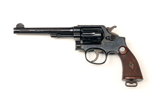 A .38, 6 SHOT REVOLVER SIGNED SMITH & WESSON, serial no. 697787 MILITARY AND POLICE MODEL with 6in, barrel,iron frame with sighting groove to topstrap, fluted cylinder the whole with large amounts of blued finish remaining (scattered areas of rust particularly to barrel exterior) with factory chequered walnut grips with S&W logos