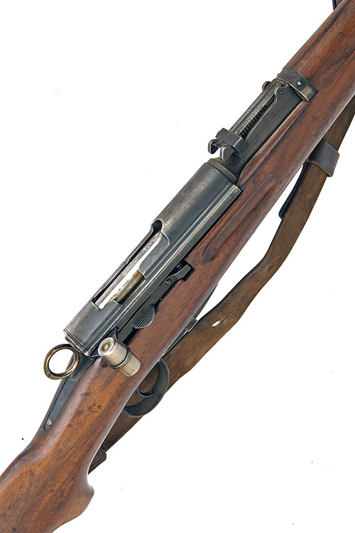 25 1/4in. nitro barrel, block-mounted fore-sight, tangent rear-sight graduated to 1500 meters, 6 round detachable magazine with matching serial no.