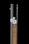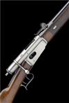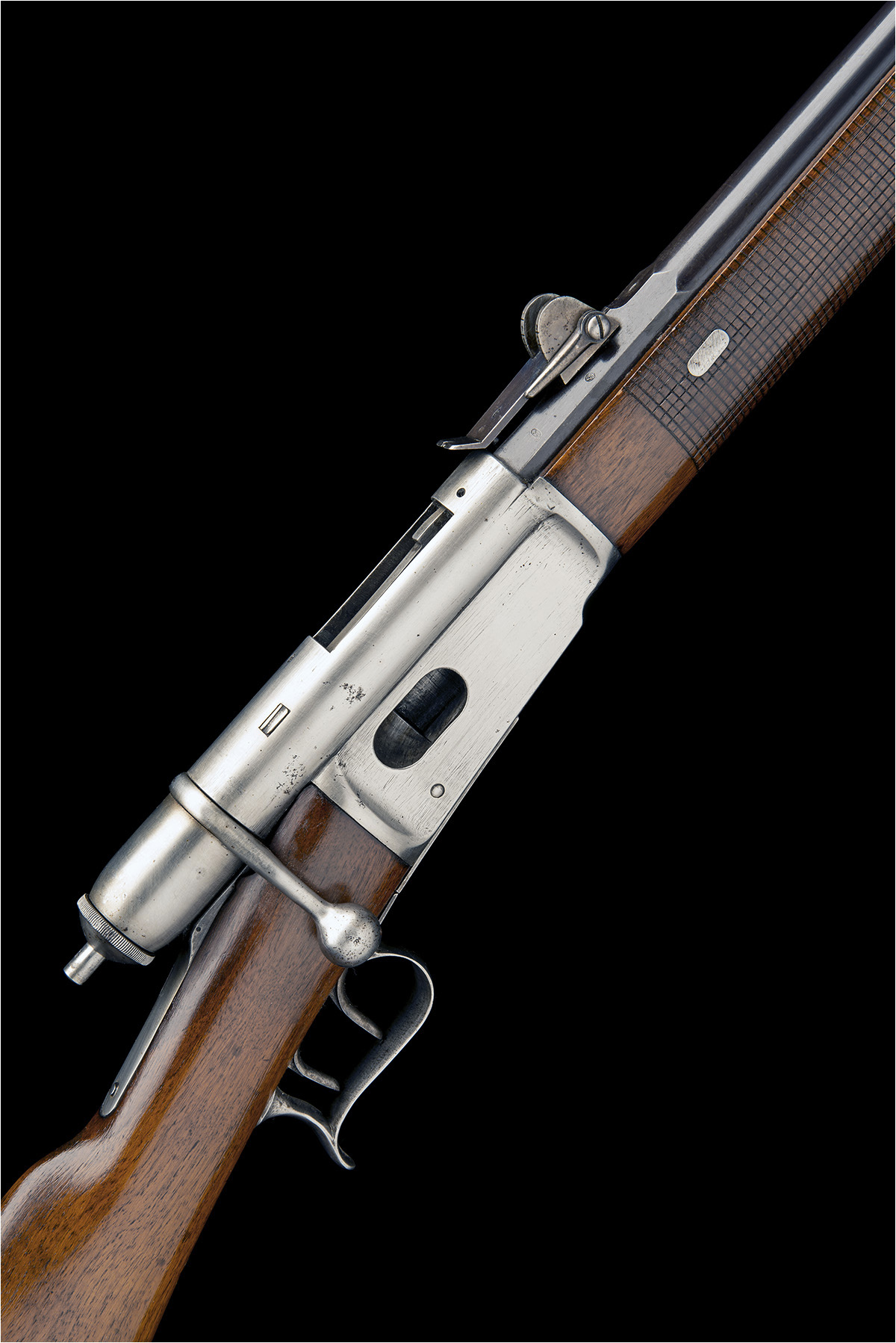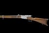 circa 1881 and of the so called 'Sharp-Shooter' variety with round 33 1/4in. barrel, octagonal breech, block and blade fore-sight, elevating tangent rear-sight, brushed bright slab-sided receiver with rounded bolt-housing, loading aperture on right hand side, turned down bolt handle, walnut butt-stock with iron heel-plate, 'sharp-shooter' double set triggers, spurred trigger-guard bow, walnut fore-end with square-cut chequering behind first barrel-band and complete with swivels and its iron clearing rod