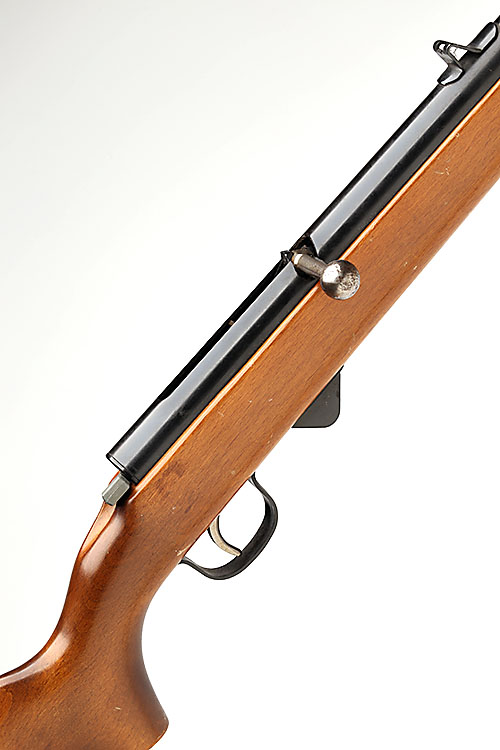 with sighted 16in. barrel, blued receiver with articulated bolt-handle, rear-mounted flag safe, beech half-stock and diecast 6 shot magazine