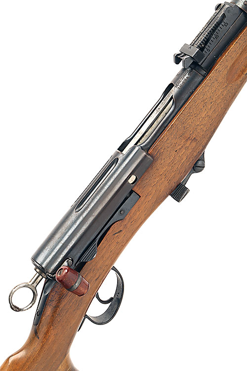 23 1/4in. reproofed barrel, block-mounted fore-sight, tangent rear-sight graduated to 1500 meters, non detachable magazine (magazine has a spring but this is a single-shot rifle), brass butt-pale, leather sling