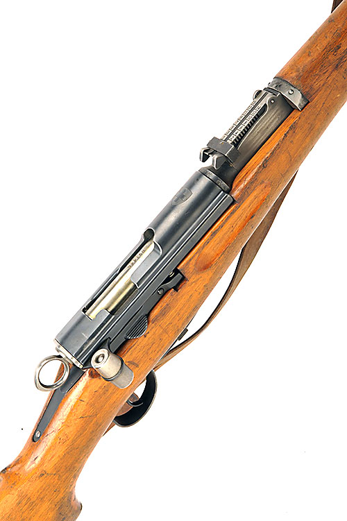 25 1/4in. nitro barrel (bore measuring 7.54/ 7.54), block-mounted fore-sight, tangent rear-sight graduated to 1500 meters, 6 round detachable magazine with matching serial no.