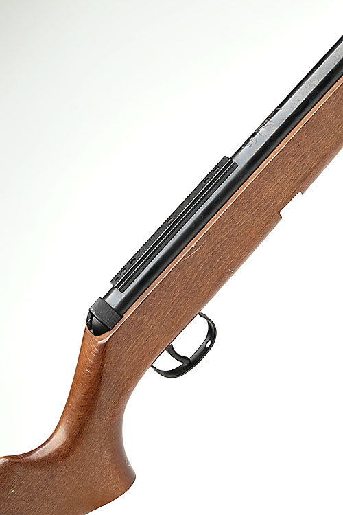 for 1996, with blued 17 1/2in. barrel (rear-sight at fault), blued air-chamber with applied rail and plain beech stock