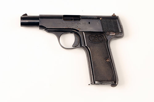 with 3 1/2 in. barrel with slide and iron frame retaining most blue colour of an older refinish, with factory hard rubber chequered grips with Walther logo.