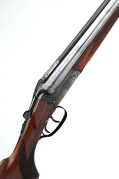** SIMSON 12-BORE BOXLOCK EJECTOR, serial no. 778732, 28in. nitro reproved barrels (in 2016, partially struck off, missing small part of rib), 2 3/4in. chambers, bored approx. 3/4 and full choke, bolstered scroll-back treble-grip action with sideclips, automatic safety, cocking indicator studs, border and partial scroll engraving, retaining some original colour-hardening and finish, 14 1/4in. pistolgrip stock with cheekpiece, sling swivels, including 3/4in. ventilated rubber recoil pad