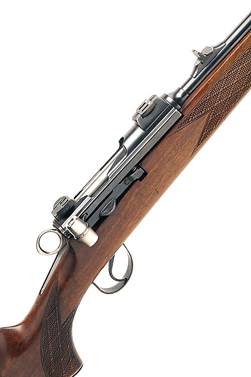 26 1/4in. nitro barrel, block-mounted blade fore-sight, leaf rear-sight, 14 1/2in. pistolgrip stock, sling swivels