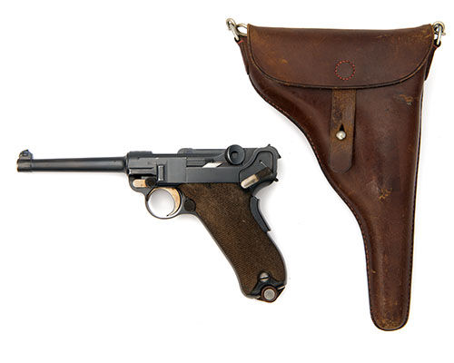 for 1901-02, with 4 3/4in. blued tapering barrel, blued receiver with Swiss cross within a starburst engraved on the breech, 'DWM monogram to the toggle, dished cocking pieces, blued frame with grip safe, chequered walnut grips, correct wood-based magazine with brushed bright circular infills to base, virtually all original blued finish and straw colour to ancilliaries (toggle a possible early factory re-finish): TOGETHER WITH a period leather holster for same marked 'L.G. WALTHER BATTLER, BERN' and dated for '1901'