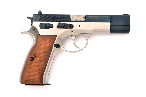 recent, with 4 1/2in. brushed bright barrel, blacked slide running on internal rails, stainless frame with ambidextrous slide release and safety catch, extended magazine release, long beaver-tail and chequered walnut grips; TOGETHER WITH its makers foam-lined carton with a spare magazine and cleaning rod, the whole appearing little used