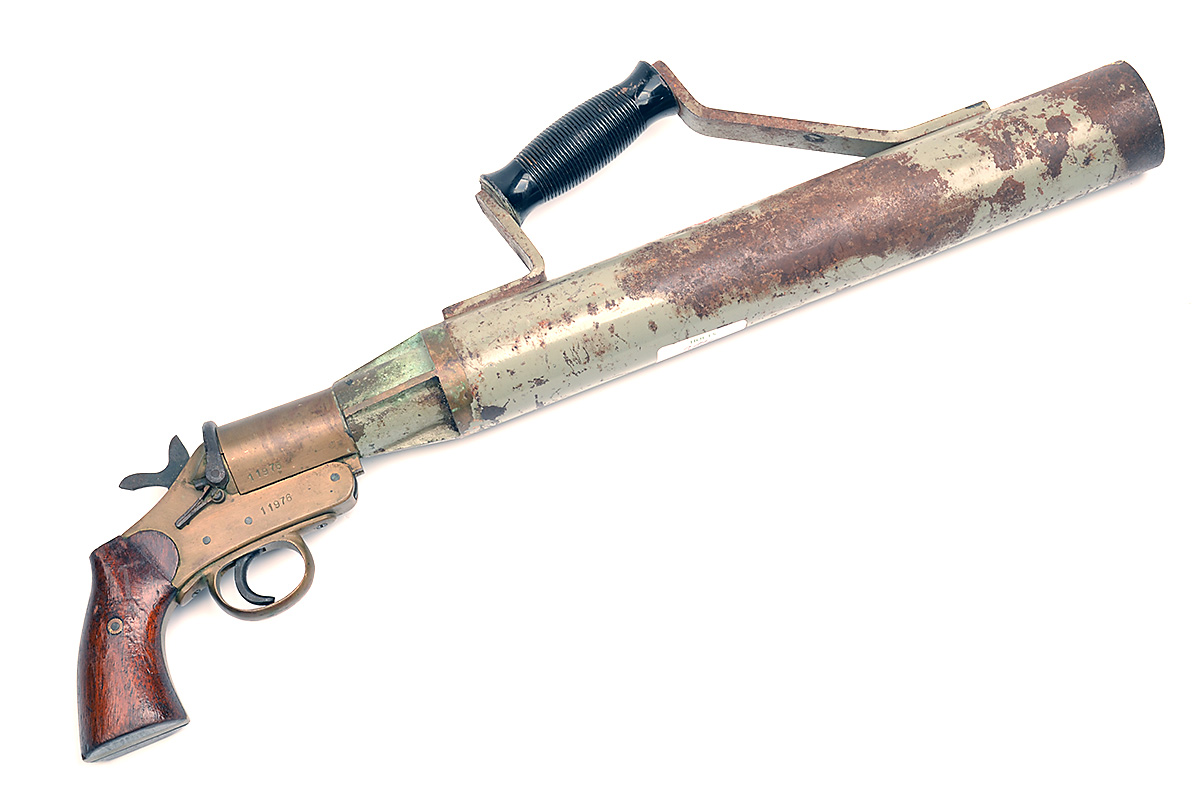 A 1 INCH SCHERMULY PATENT 'SCHERMULY PISTOL ROCKET APPARATUS' LINE LAUNCHER, serial no. 11976, with 16 1/2in. grey painted launcher tube with handle, brass flare pistol action and breech, walnut grips.