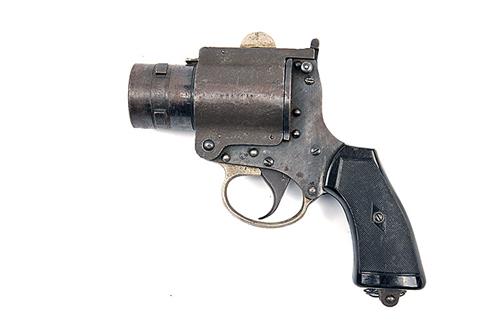 A 1 1/2IN. SINGLE SHOT FLARE PISTOL, UNSIGNED, MODEL ' BRITISH 'NO. 4 MK 1*' , serial no. 2300, with four rectangular lugs near the muzzle for locking into an aircraft fuselage, with British War department inspection marks.