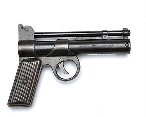 A .177 BARREL-COCKING AIR-PISTOL SIGNED WEBLEY & SCOTT, MODEL JUNIOR, serial no. J23667, circa 1937, with 6in. smoothbore barrel, blued air-chamber with model, makers and patent details, iron frame and ribbed tinplate grips, good amount of finish remaining
