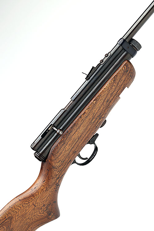 A .22 CO2 POWERED AIR-RIFLE SIGNED CROSMAN, MODEL 180, no visible serial number, circa 1967, with blued 18in. barrel, bolt action loading, blued reservoir and walnut half-stock