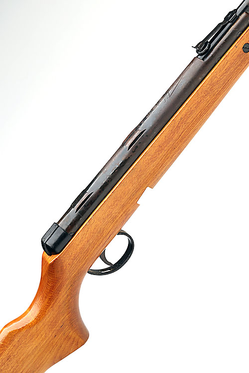 A .22 BREAK-BARREL AIR-RIFLE SIGNED BSA, MODEL METEOR, serial no. TA32128, early type, with 18in. sighted barrel, air-chamber with twin section rail and beech half-stock, finish worn