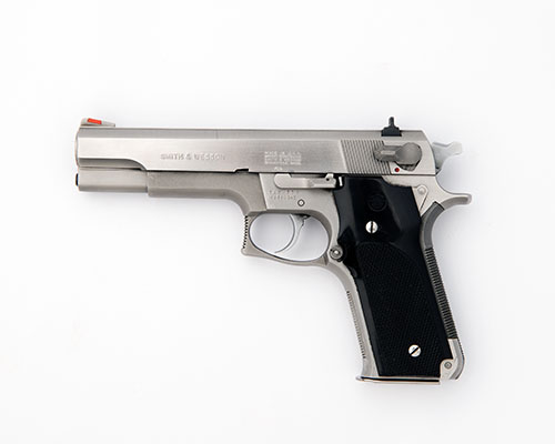 recent, with exposed 5in. barrel, stainless slide marked with the maker details, blade fore-sight, dove-tailed rear-sight, ambidextrous safety, matt stainless frame with chequering to the trigger-guard, front and back-straps, exposed hammer and black plastic chequered grips