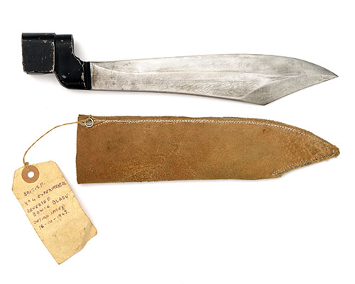 Other Notes: An old label from a previous collector states that this is a British No4 Experimental reversed bowie bladed bayonet designed 16-10-1943. It has not been possible to verify this, although the blade, whilst smaller, bears distinct similarities to the experimental reverse bowie bladed Australian Jungle bayonet, and could possibly be related to the same trials