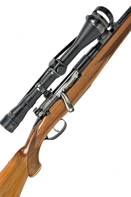 A STEYR-DAIMLER-PUCH .243 'MANNLICHER SCHOENAUER MOD. MC' BOLT-MAGAZINE SPORTING STUTZEN RIFLE, serial no. 24953, 20in. nitro barrel with ramp-mounted bead fore-sight with cover, rear sight of one standing and one folding leaf, fitted with a Pecar 6x45 telescopic sight, 13 3/4in. pistolgrip stock including buttplate, raised swept cheekpiece, sling swivels