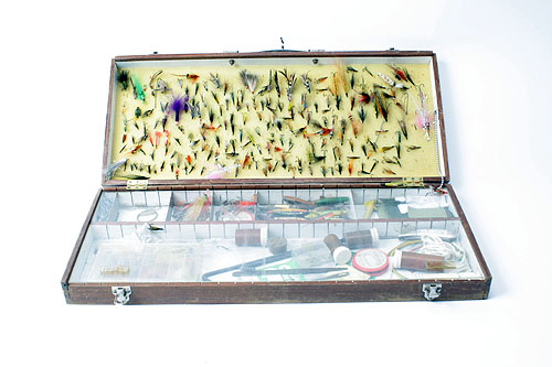 A COLLECTION OF SALMON FLYS AND MINNOWS, including some fly tying equipment
