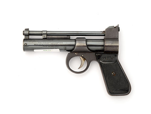 A .177 BARREL-COCKING AIR-PISTOL SIGNED WEBLEY & SCOTT, MODEL 'JUNIOR', batch no. 3904, early post war adjustable sight version with Birmingham address, 6in. barrel, blued finish and chequered hard rubber grips, much finish remaining