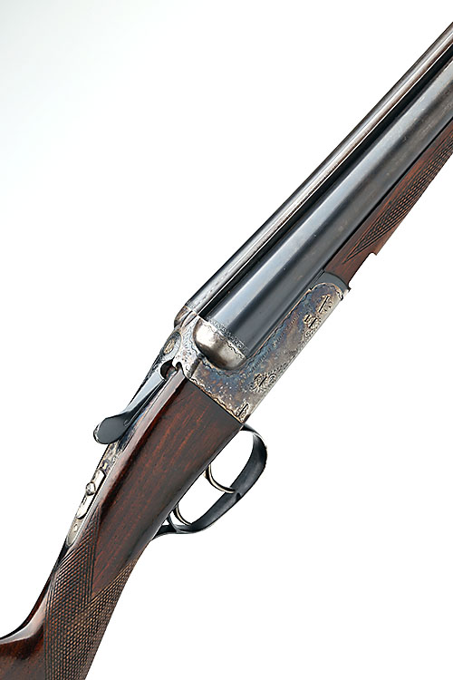 AYA 12-BORE BOXLOCK EJECTOR, serial no. 385340, 26in. nitro barrels, 2 3/4in. chambers, bored approx. 1/4 and 3/4 choke, removable striker discs, automatic safety with gold-inlaid 'S' detail, border engraving, retaining some original colour-hardening and finish, 14 1/4in. stock, weight 6lb. 7oz.