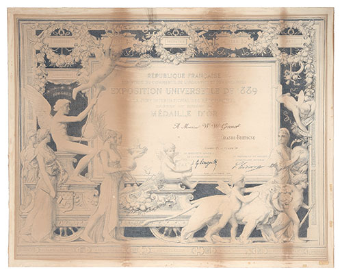 REPUBLIQUE FRANCAISE EXPOSITION UNIVERSELLE DE 1889, MEDAILLE D'OR 22 1/2in. x 18 1/8in., unframed, some fading and staining
