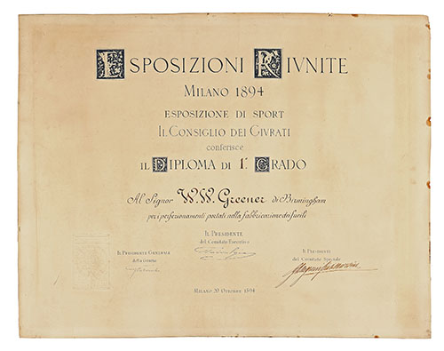 ESPOSIZIONI RIVNITE MILANO 1894, IL DIPLOMA DI 1 GRADO 25in. x 20 1/8in., unframed, some fading and staining, light damage to edges