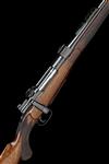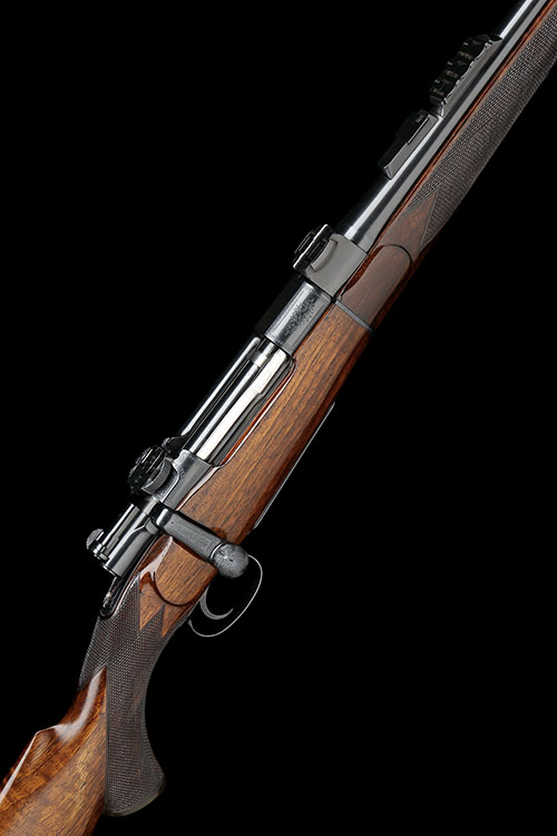 26in. nitro barrel engraved 'DANl. FRASER & CO. GUN & RIFLE MANUFACTURERS. 4 LEITH ST. TERRACE. EDINBURGH.', block-mounted open sights with two folding leaf sights, matted finish with inlaid sight lines and marked for 100, 200 and 300 yards, block-mounted bead fore-sight with flip-up moonsight, original Fraser scope mount base remaining and knox form with later claw mount base, detachable bolstered fore-end with sculpted tip (with repair) and Deeley & Edge patent release catch, receiver with solid side wall and with acanthus scroll and ropework engraving, mounted with a Schmidt & Bender 1 1/2-6x telescopic sight in (later) quickly detachable mounts, barrel release screw, acanthus scroll and ropework engraved floorplate with military style release inscribed 'FITTED WITH FRASER'S PATENT TRIGGER ACTION', the triggerguard engraved with the serial number, the sides of the trigger with acanthus scroll detailing, highly-figured pistolgrip stock with cheekpiece, inset sling eye and with horn pistolgrip-cap and buttplate, 14 1/2in. pull, weight 7lb. 8oz. (unscoped) and 9lb. 3oz. (with scope), in its brass-cornered oak-lined leather case with gold-tooled Fraser trade label and serial numbered 'The Fraser Patent Telescopic Sight' instructions label, the lid outer initialled 'J.B.P', the brass lock engraved 'J.B. PEASE. NEWCASTLE-UPON-TYNE', the modern telescopic sight in a leather scope slip