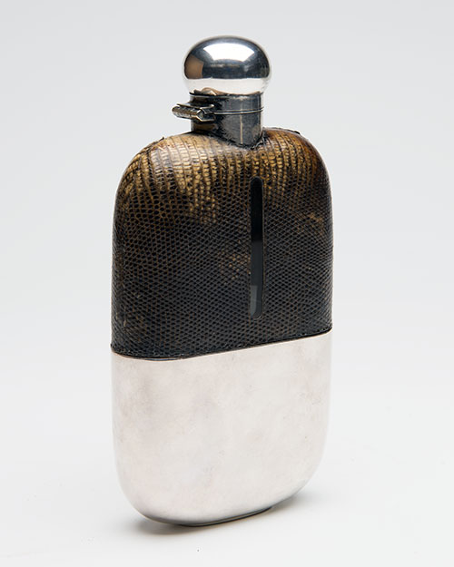 A VINTAGE SILVER-PLATED AND SNAKESKIN-BOUND DRINKING FLASK